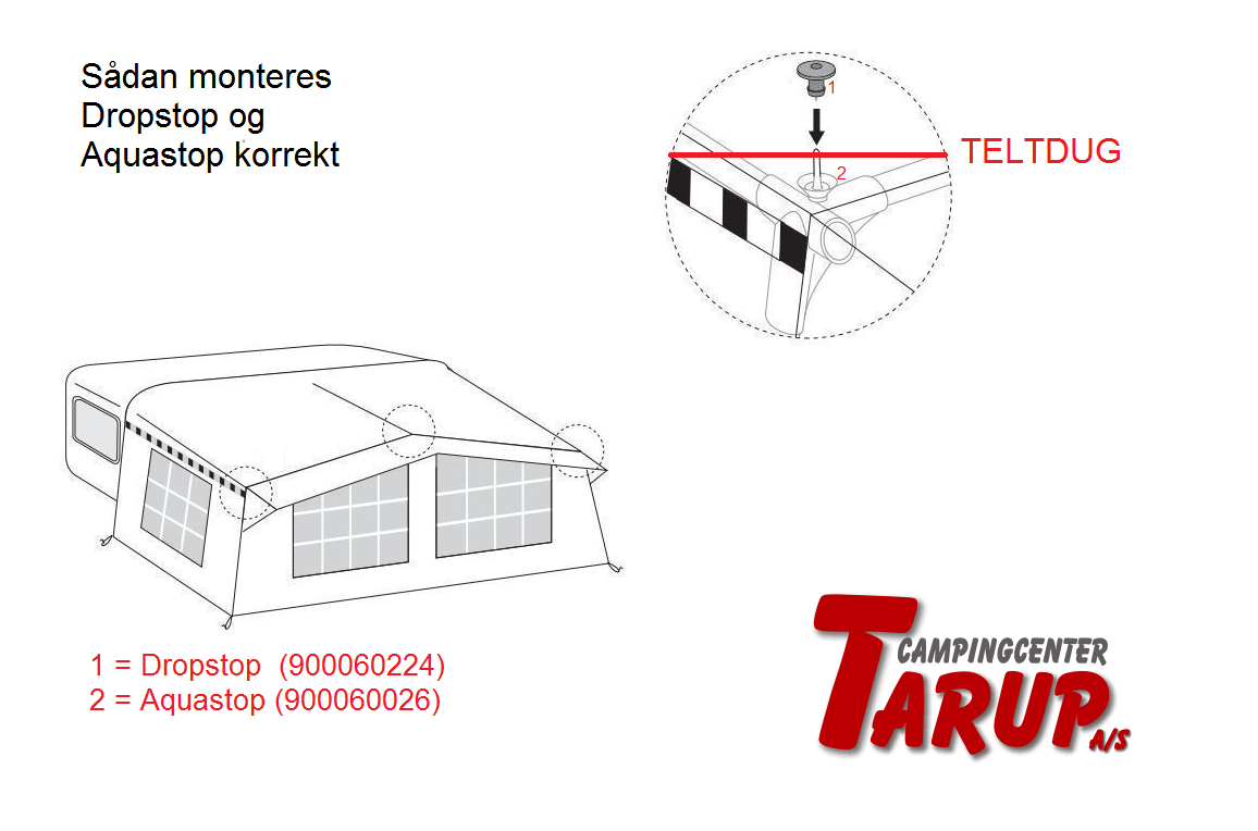 For at opnå det bedste og tætteste resultat, skal du bruge 1 stk. Aqua Stop Regnhætte og 1 stk. Drop Stop Regnfanger (varenr:900060224). Aqua Stop under teltdugen, og Drop Stop over teltdugen.