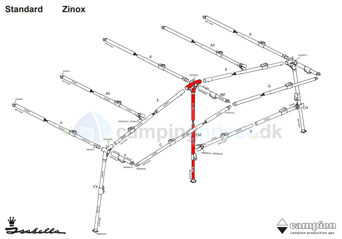 Isabella teltstang - ben i midt front af Isabella fortelt med en dybde på 250 - 300 cm i Zinox - passer på stel i G10-G18