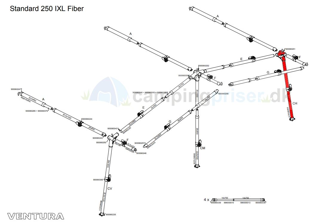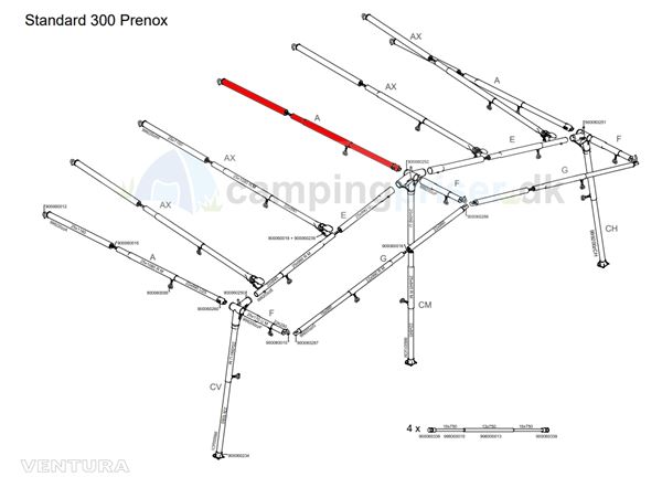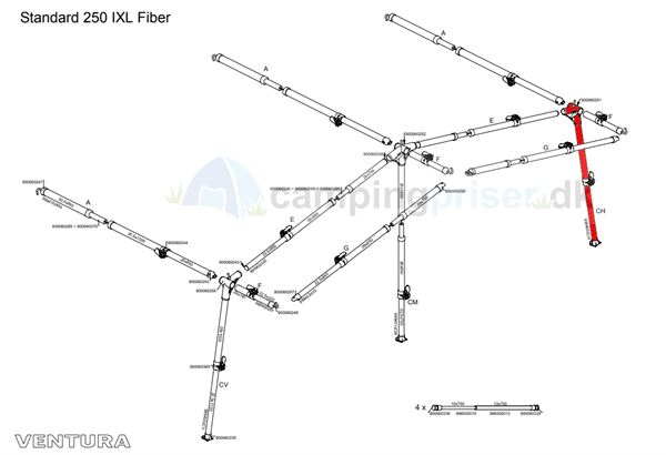 Teltstang med højre hjørne samt ben med fod - stangen passer både til fortelt i dybde i 250 og 300 cm