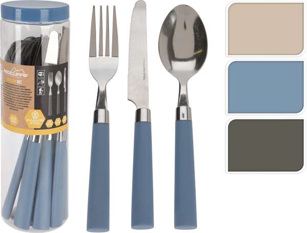 Bestiksæt bestående af 12 dele i rustfrit stål i beige, blå eller grå