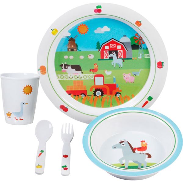 Børneservice med bondegårdsmotiv i melamin