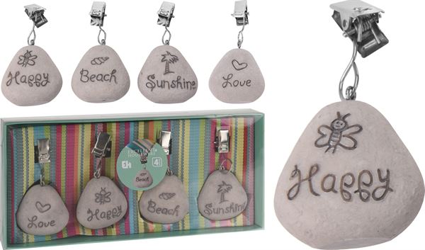 4 stk. vægte til at holde dugen på plads i form af sten, som er dekoreret med sommer tegninger og ord.