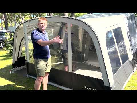 Isabella Camp-let Living Plus Sand fastgøres nemt til camp-letten ved hjælp af lynlåse og giver et stor overdækket udendørs areal med læ for vinden og skygge for solen, de faste sider kan lynes op og rulles væk for at skabe et mere åbent rum.