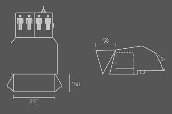 Med en dybde på 158 cm og en bredde på 285 cm skaber Sunset solsejlet et rummeligt overdækket område, der beskytter både dig og din teltvogn.