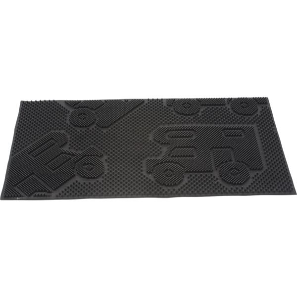Sort dørmåtte i gummi med smart camping-motiv.  Mål: 25 x 50 cm.