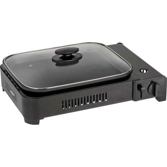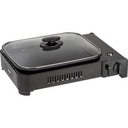 Udover grillpladen medfølger en stor bradepande med glaslåg.