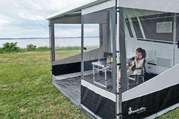 Skab et hyggeligt uderum foran din campingvogn/autocamper eller van med Windfront, som nemt monteres på din markise for ekstra læ og komfort. .