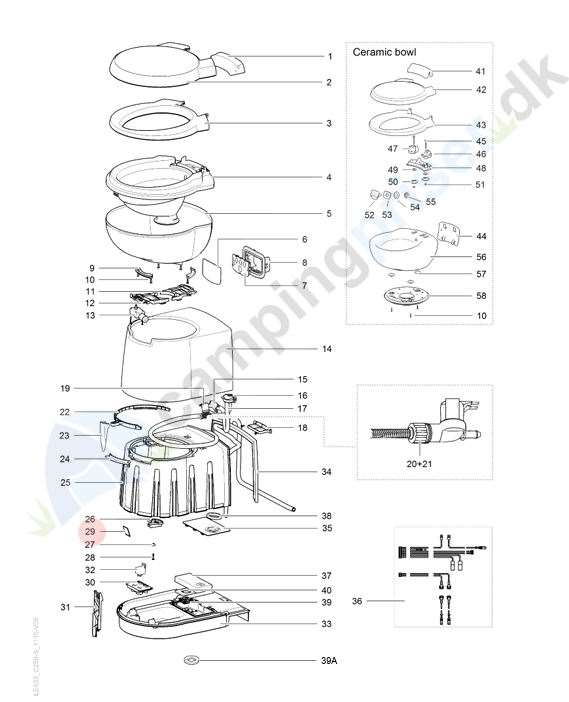 Rød kontakt til Thetford toilet C250 model med skylleknap og niveau indikator for affaldstanken.