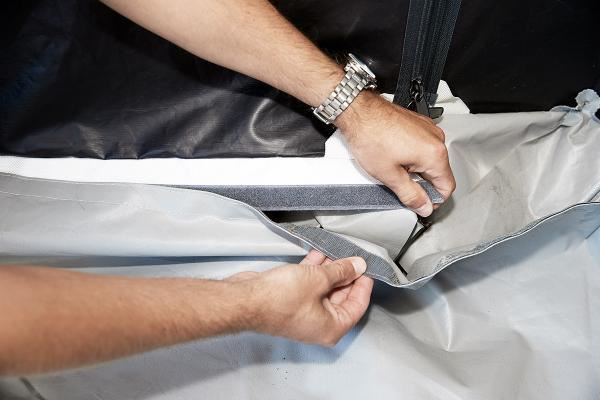 Undgå vand og kondens i teltet, med en kunststofbund lavet af Kraftig PVC, med høj kant, monteres nemt med burrebånd.