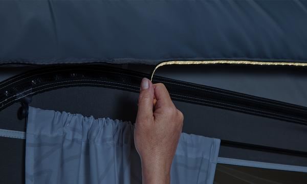 Lysbåndene kan lyse hele teltet op eller dæmpes med Isabellas LED lysdæmper, som skaber en stemningsfuld hyggebelysning.