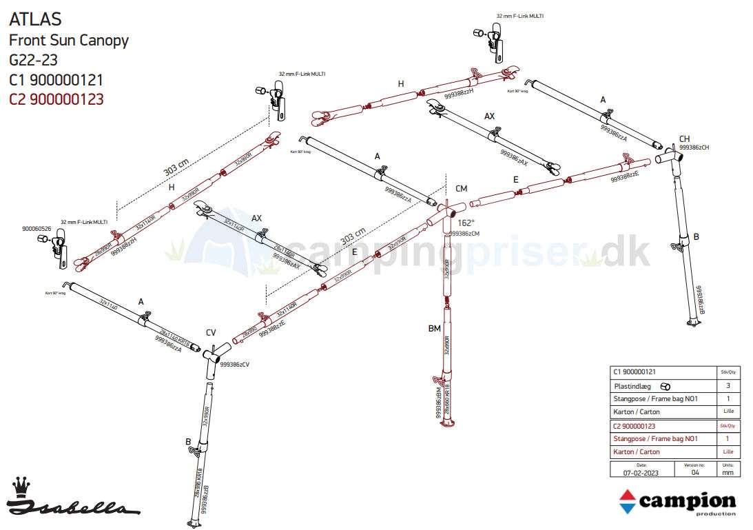 Isabella Mega stel (32 mm)  til Frontsolsejl ATLAS G22 - G23 - alle stænger mærket med rød farve - C2