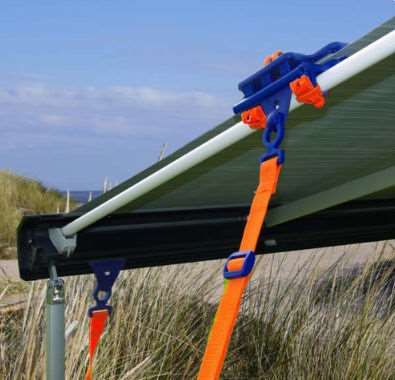 Den nye Peggy Peg Fix&Go AntiFlap klemmes fast på dugen og markisens understøtte for at forhindre, at dugen blafrer når vinden rusker.