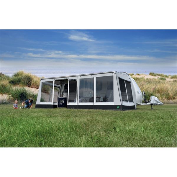 * Denne variant af Rolli monteres på køretøjet som et fortelt, idet både markiser og siden trækkes i  teltskinnen. Det betyder,      at siderne slutter tæt mod køretøjet, så blæst mm. holdes ude.