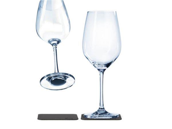 Vinglas med en integreret magnet i bunden og medfølgende Metalic-Nano-Gel-Pad der sikre, at glasset ikke vælter.