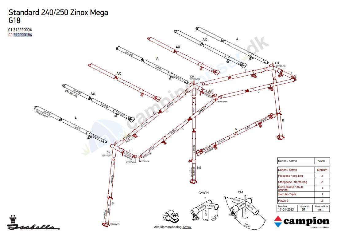 Isabella Mega Stel til standard fortelt G18 med dybde på  240 - 250 cm med MegaFix beslag - C2