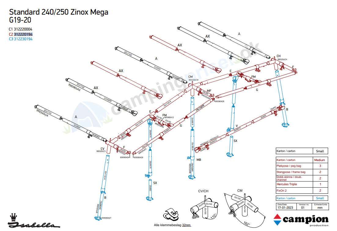 Isabella Mega Stel til standard fortelt G19-20 med dybde på  240 - 250 cm med MegaFix beslag - C2