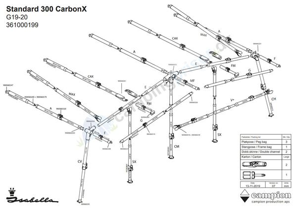 CarbonX™ fiberstel Isabella har udviklet det unikke CarbonX-stativ i samarbejde med Exel. Det er et kulfiber-forstærket glasfiberstativ, som er specielt velegnet til rejsecamping, men også til standcamping, da det er let og fuldstændig korrosionsfrit. Inkl. Stangpose og pløkker. 1.Langsgående glas- og kulfibre 2.Krydsvikling 3.Langsgående glasfibre 4.Krydsvikling med uret 5.Krydsvikling mod uret 6.Lak