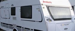 Klistermærke logo - streamer til Dethleffs - ved siden af vindue
