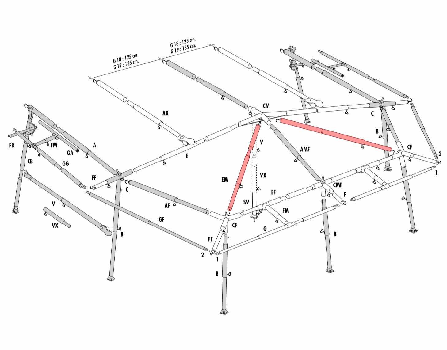 EM-stang til taget i Isabella Penta, denne ene ende af stangen sidder i den krog som er på tagkrydset og den anden ende i hjørnet af fronten på forteltet.