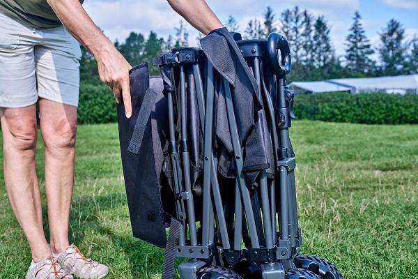 Bunden er aftagelig og giver stabilitet under brug – og kan nemt tages ud, når vognen skal foldes sammen.