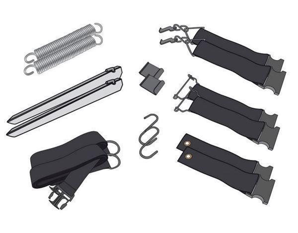 Komplet Tie Down sæt, der passer til alt og indeholder specialdele til Dorema, Fiamma og Omnistor.