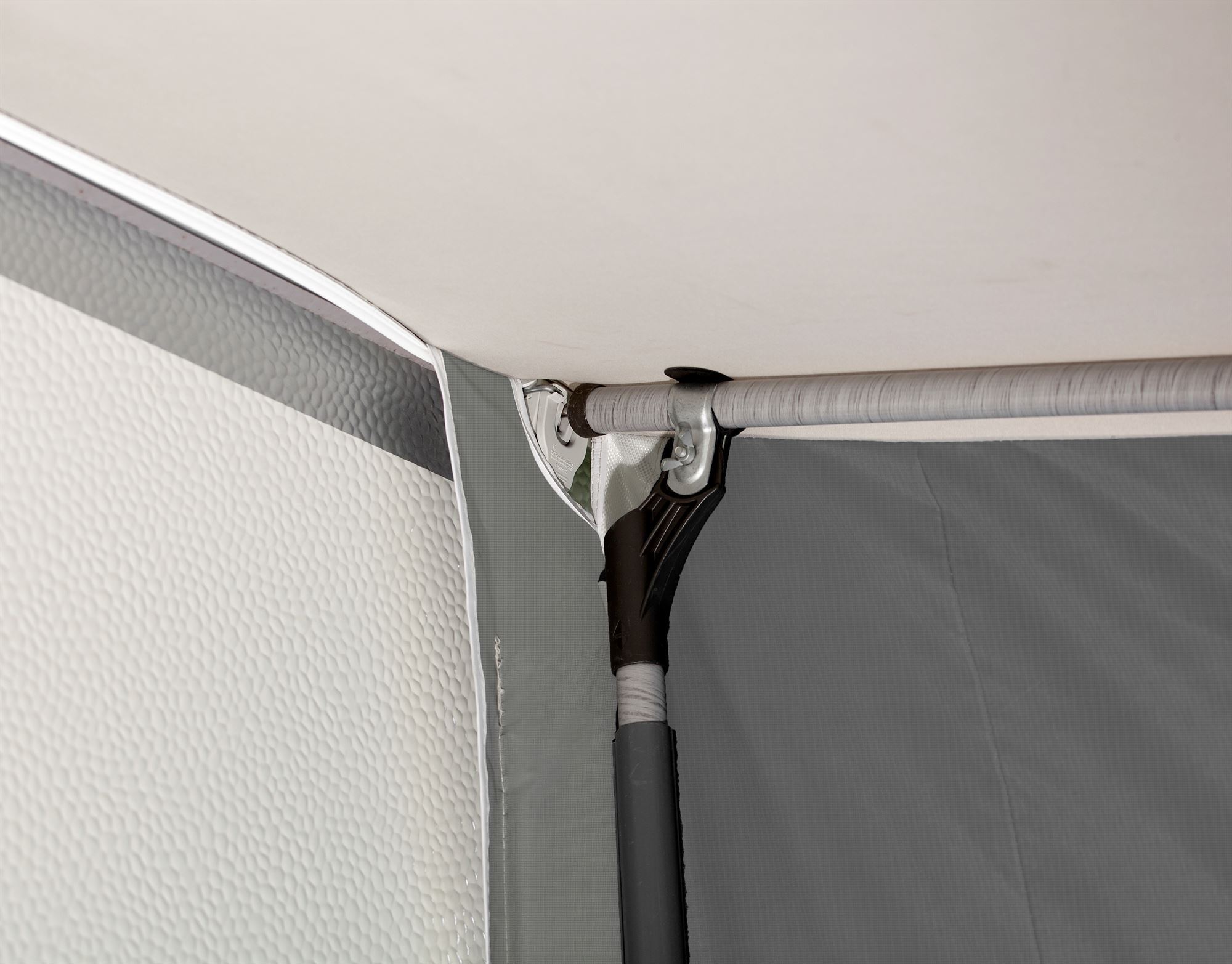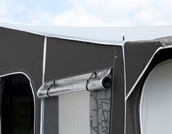 Forteltet slutter tæt til siden af campingvognen takket være de isyede skumpuder, støttestængerne og tilslutningsprofilerne, der leveres som standard.