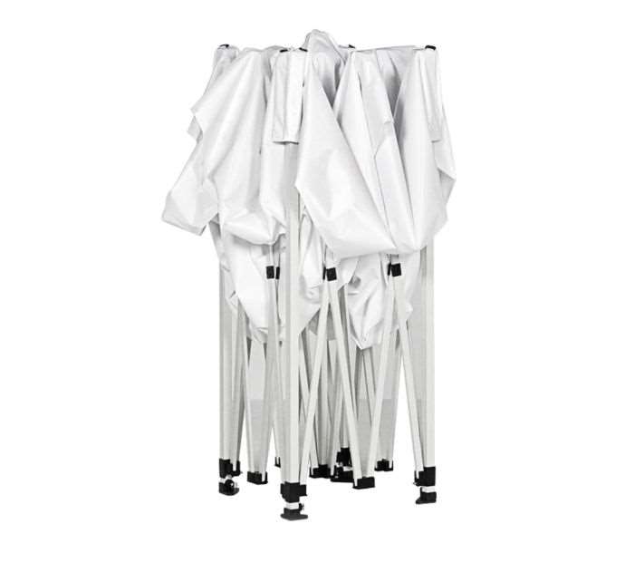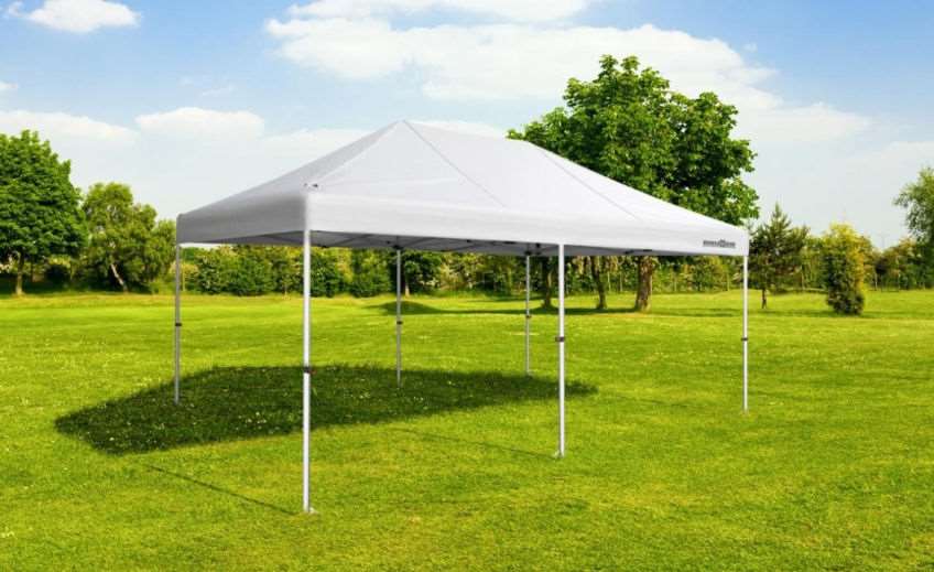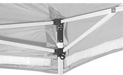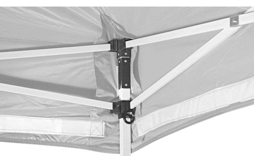Pavillonen har et spidst tag, der nemt strammes op vha. håndsving.